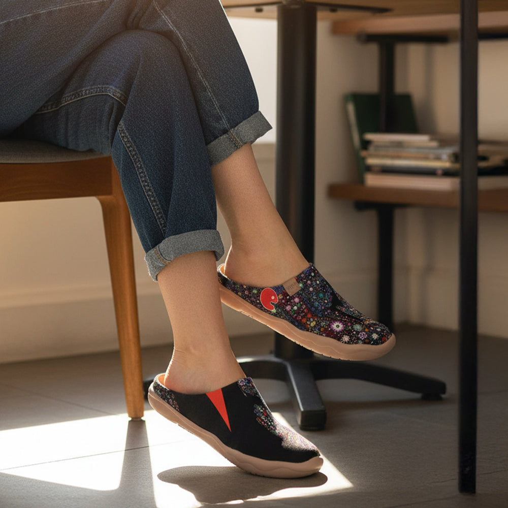 I LOVE these mules. You can replace their bed with your own orthotics. They are comfortable and stylish. The ones I’m wearing are the second pair in another pattern. They are made from canvas and it’s worth it to break them in around the house before wearing them for a longer period of time (at least for me). My feet are on the wide side, and these were comfortable. I wear these barefoot and ordered my normal size. If you plan on wearing these with thick socks, I would suggest getting a 1/2 size up. Enjoy yours!